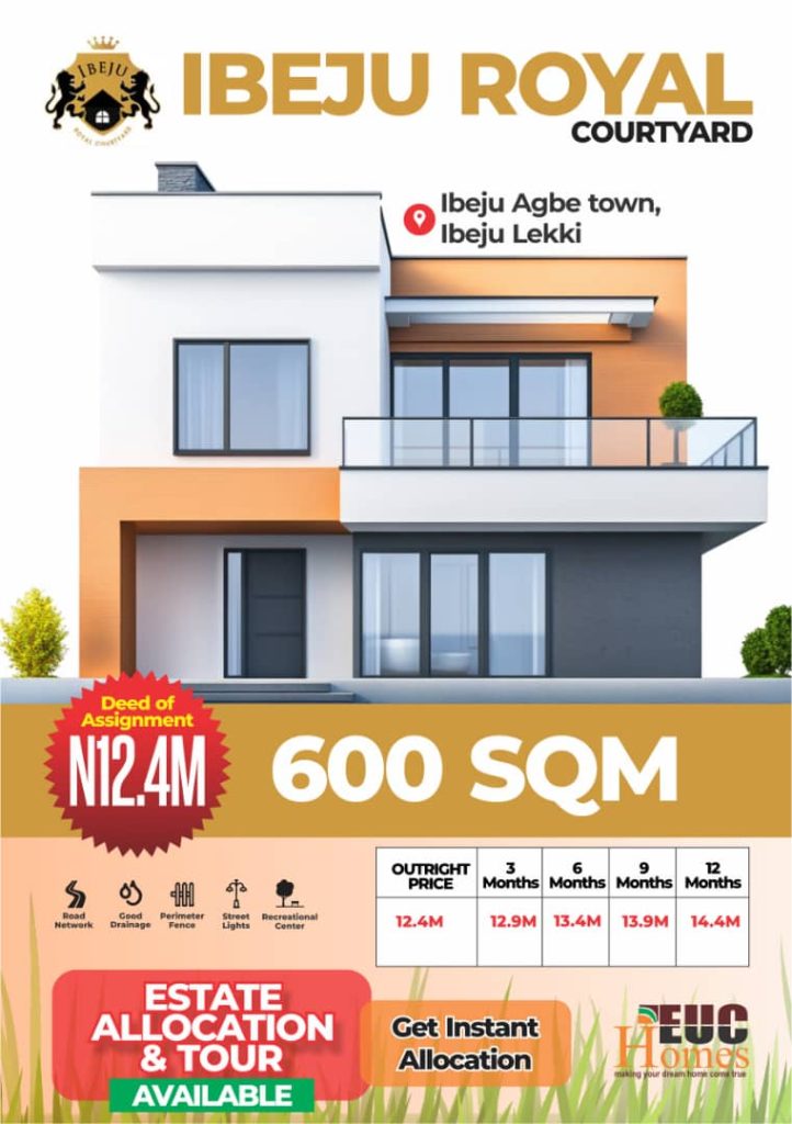 Ibeju Royal Courtyard, developed by EUC Homes, is a residential community located in Ibeju-Lekki, Lagos State, Nigeria. This estate is designed to offer a blend of modern living and natural beauty, catering to families and individuals seeking a serene environment.